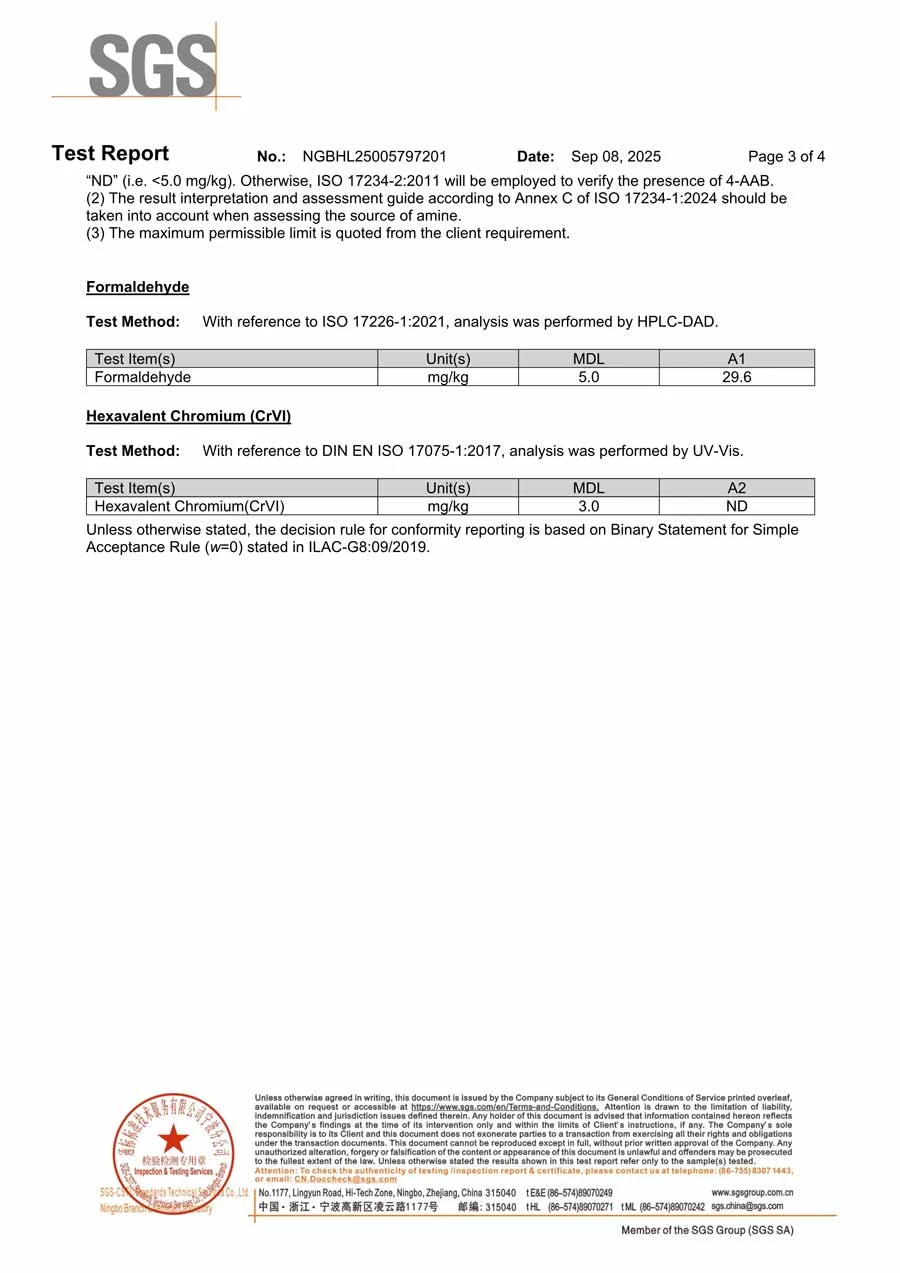 We provide international SGS test certificates. Our products are certified free of chemical factors such as formaldehyde, hexavalent chromium, and azo dyes. We can also supply corresponding test certificates based on your requirements  >>>>>
